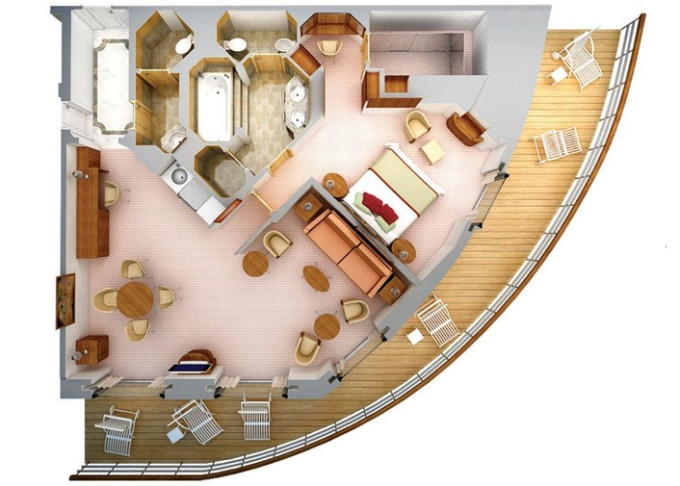 | R1 - Royal Suite 1 92 m² (vrátane balkóna 12 m²), Spálňa s obývacou a jedálenskou časťou. 7. paluba vpredu. Max 3 osoby. | 27 000 € 13 500 € za osobu | ||