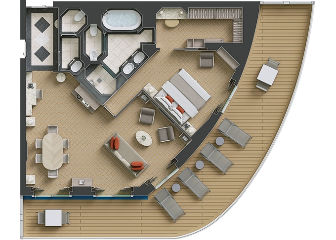 | O1 - Owner's Suite 1 88 - 98 m² (vrátane balkóna 12 m²). 9. paluba - stred. Max 3 osoby. | 46 800 € 15 600 € za osobu | ||