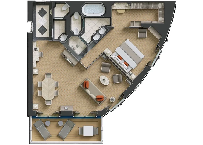 | R1 - Royal Suite 1 105 m² (vrátane balkónu). 7. paluba vpredu. Max 3 osoby. | 24 200 € 24 200 € za osobu | ||