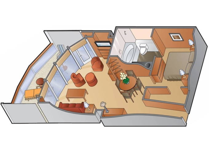 - Kajuty sú umiestnené v blízkosti lodného Spa. K ich vybaveniu patrí posilnený systém vzdušnej filtrácie, posteľ Queen-Size (v kategóriách Edge King-Size), veľké zasúvacie sklenené dvere, exkluzívne posteľné prádlo eXhale®, veľkorysé skladovacie priestory.