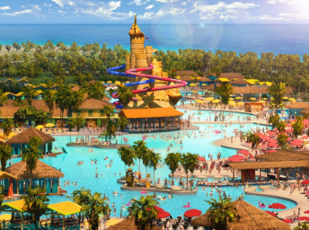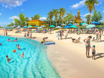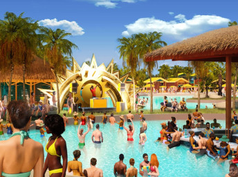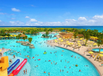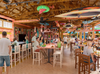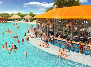 - Floating AquaBanas (12 kabín na prenájom) poskytujú osem miest na sedenie, pevný stôl, protišmykové povrchy a priamy prístup do Starfish Lagoon. Chatky sú zoskupené okolo polostrova s vyhradeným nápojovým barom